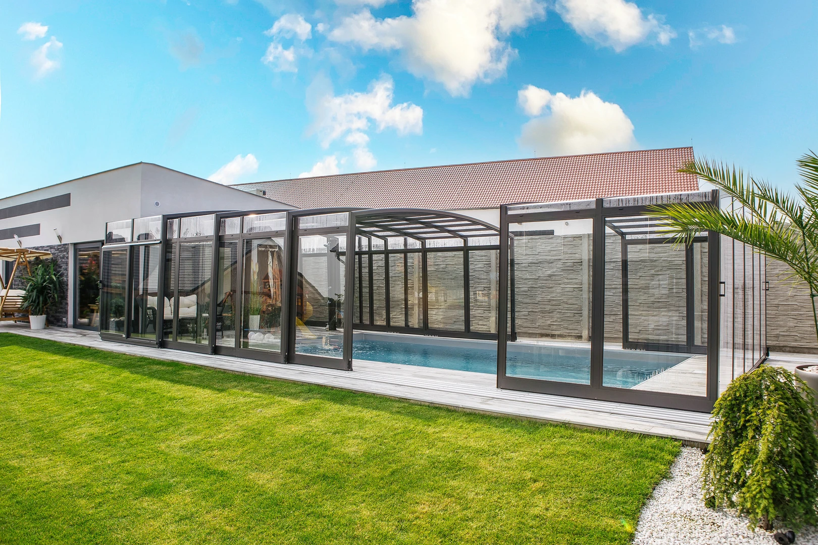L’abri OMEGA incarne l’excellence en matière d’abris télescopiques. Véritable chef-d’œuvre technologique, il séduit par sa forme unique créant une illusion d’optique qui allège visuellement le volume couvert. Sa façade renforcée indépendante garantit une stabilité optimale, tandis que ses profilés en aluminium et son polycarbonate compact transparent offrent résistance, clarté et durabilité. Facile à manipuler et verrouillable à clé pour une sécurité totale, l’OMEGA allie esthétique avant-gardiste et performance technique, affirmant Alukov comme une référence dans la conception d’abris de piscine haut de gamme.