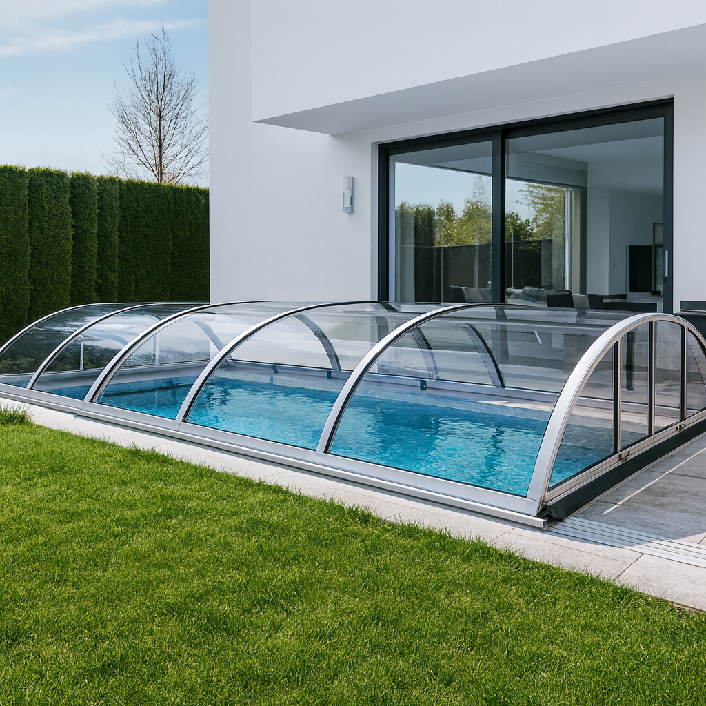 Avec sa forme arquée et sa structure en hauteur, cet abri transforme votre bassin en un véritable espace de détente utilisable en toutes saisons. Sa grande transparence offre une immersion visuelle dans le jardin tout en protégeant la piscine des éléments extérieurs. L’abri permet de nager ou de circuler confortablement autour du bassin, même lorsqu’il est fermé. Il agit comme une véranda légère, augmentant la température intérieure de manière naturelle. Son système d’ouverture télescopique permet une ventilation modulable selon les besoins. Il s’adresse aux utilisateurs souhaitant conjuguer esthétique, protection, confort thermique et liberté de mouvement autour de leur piscine.