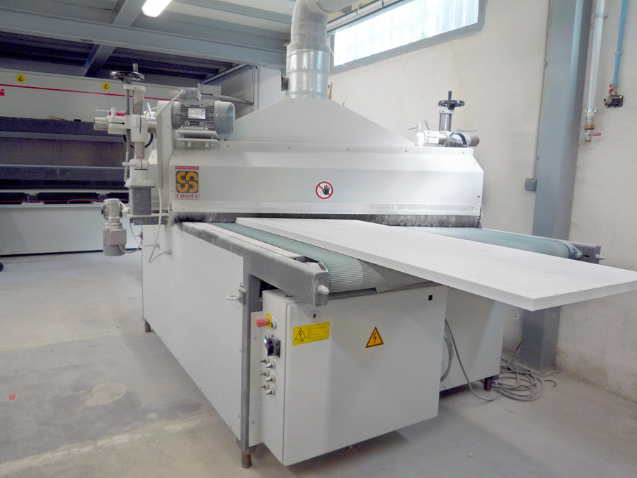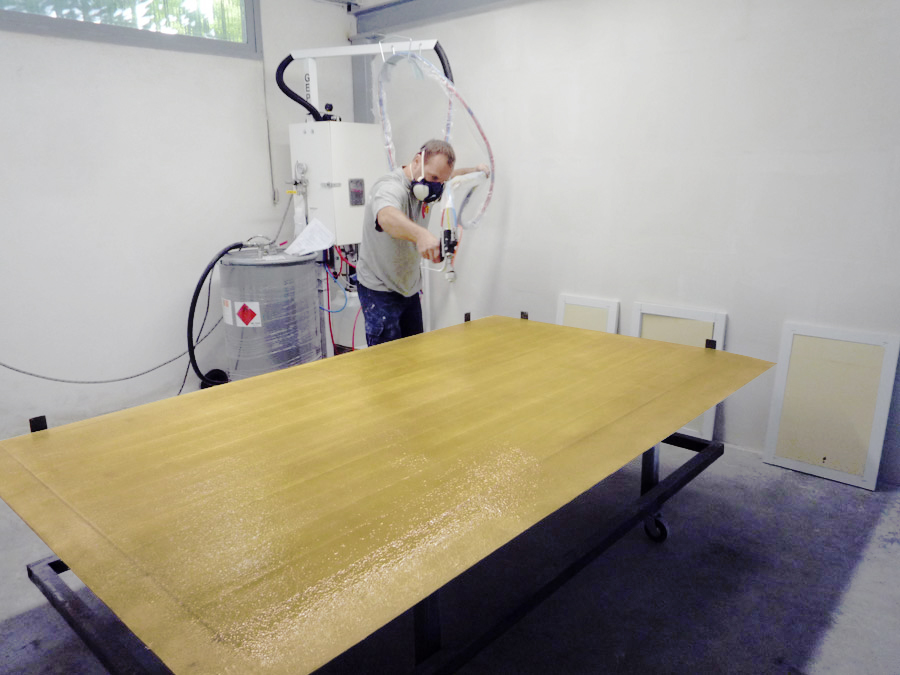 L’ossature est ensuite remplie de mousse polyuréthane à haut pouvoir isolant, puis assemblée sous presse hydraulique de 160 tonnes. Après ponçage, les chants sont appliqués à chaud à l’aide d’une colle résistante à l’eau et aux fortes chaleurs.