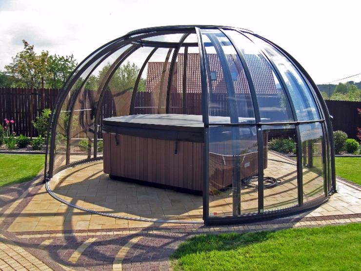 Abri de spa sphérique, télescopique et sans rails : une partie fixe au sol, une partie mobile (manuelle ou motorisée) pour accéder au jacuzzi en un geste, toute l’année.
