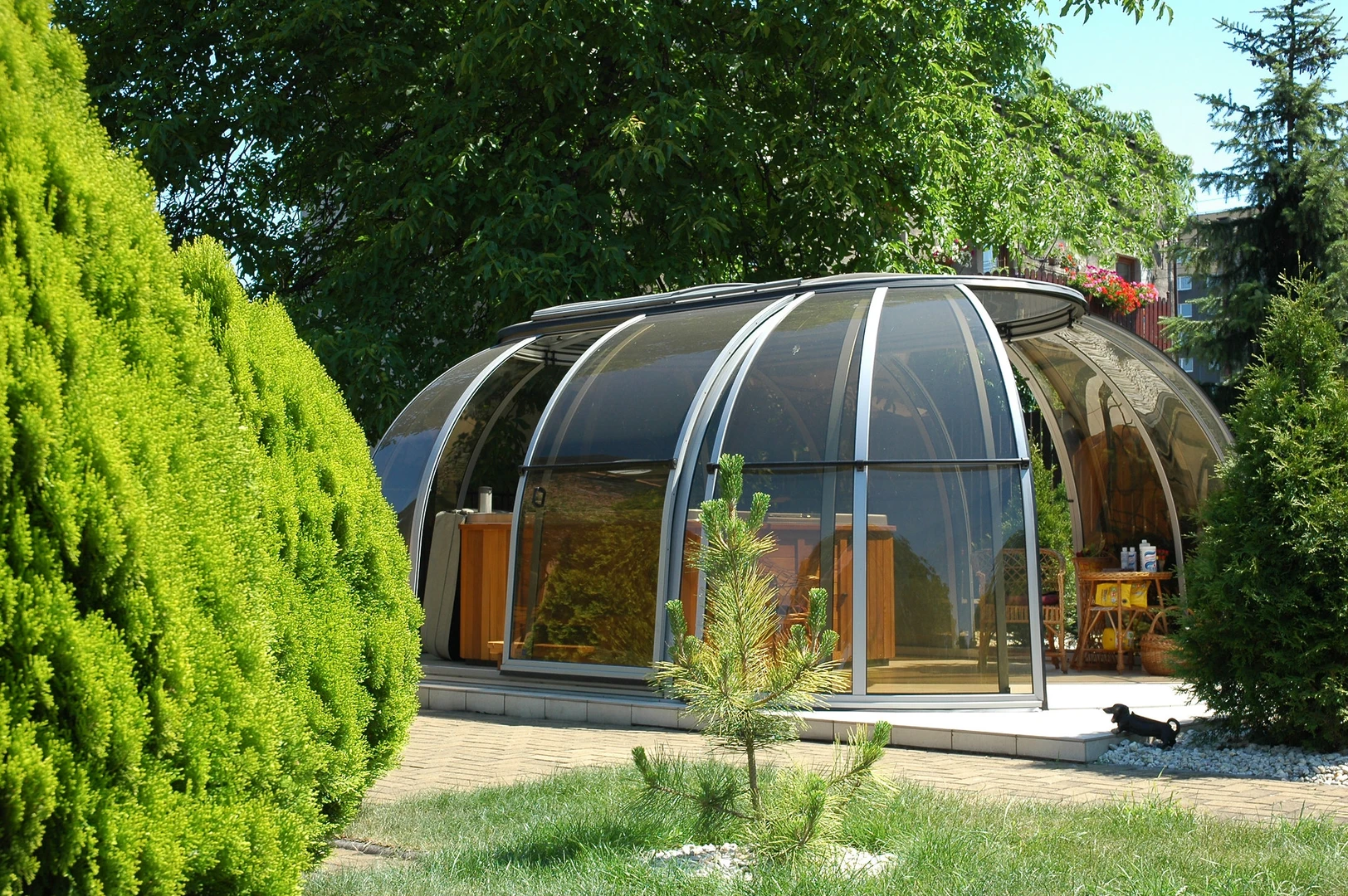 Offrez à votre spa un pavillon lumineux et pratique : forme ovale, toit ouvrant, doubles portes coulissantes pour circuler facilement et ventiler à la demande.
